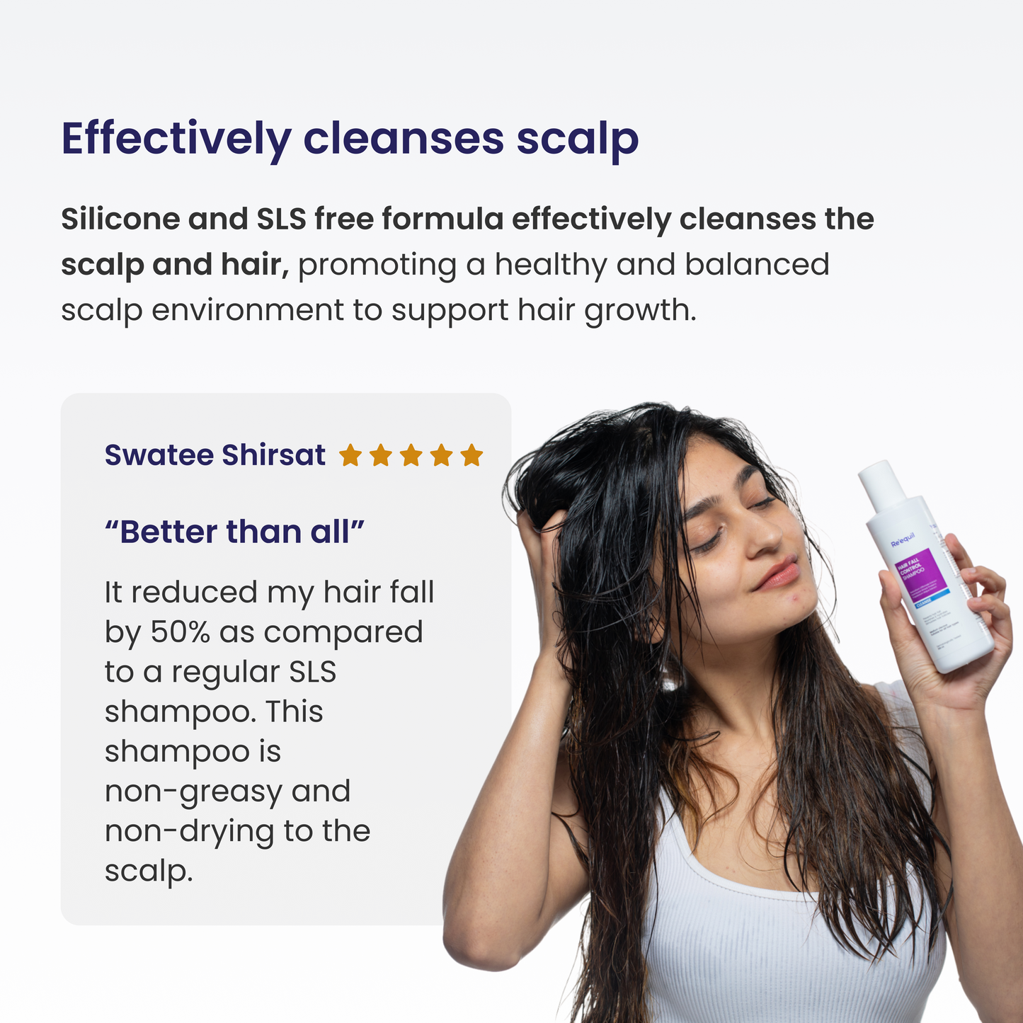Hair Fall Control Shampoo’s silicone and SLS free formula promotes a healthy and balanced scalp environment that is conducive for new hair growth. This occurs because it does not cause any product build-up on the scalp.