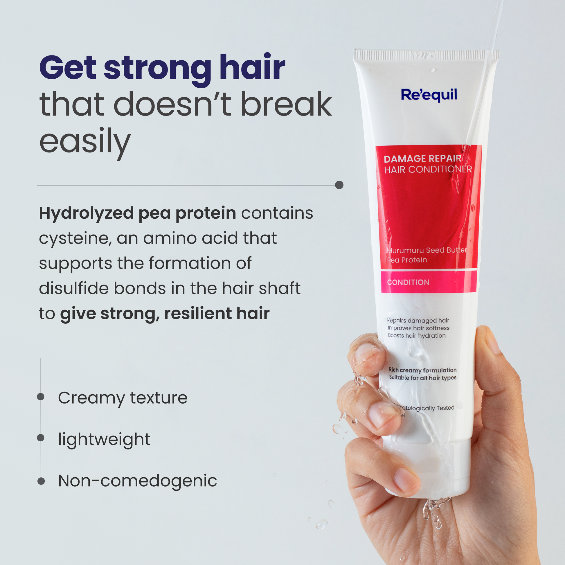 Hydrolyzed pea protein undergoes hydrolysis, which breaks down the protein into smaller peptides or amino acid chains. This improves penetration of peptides and proteins into the hair shaft, strengthening the hair from within.