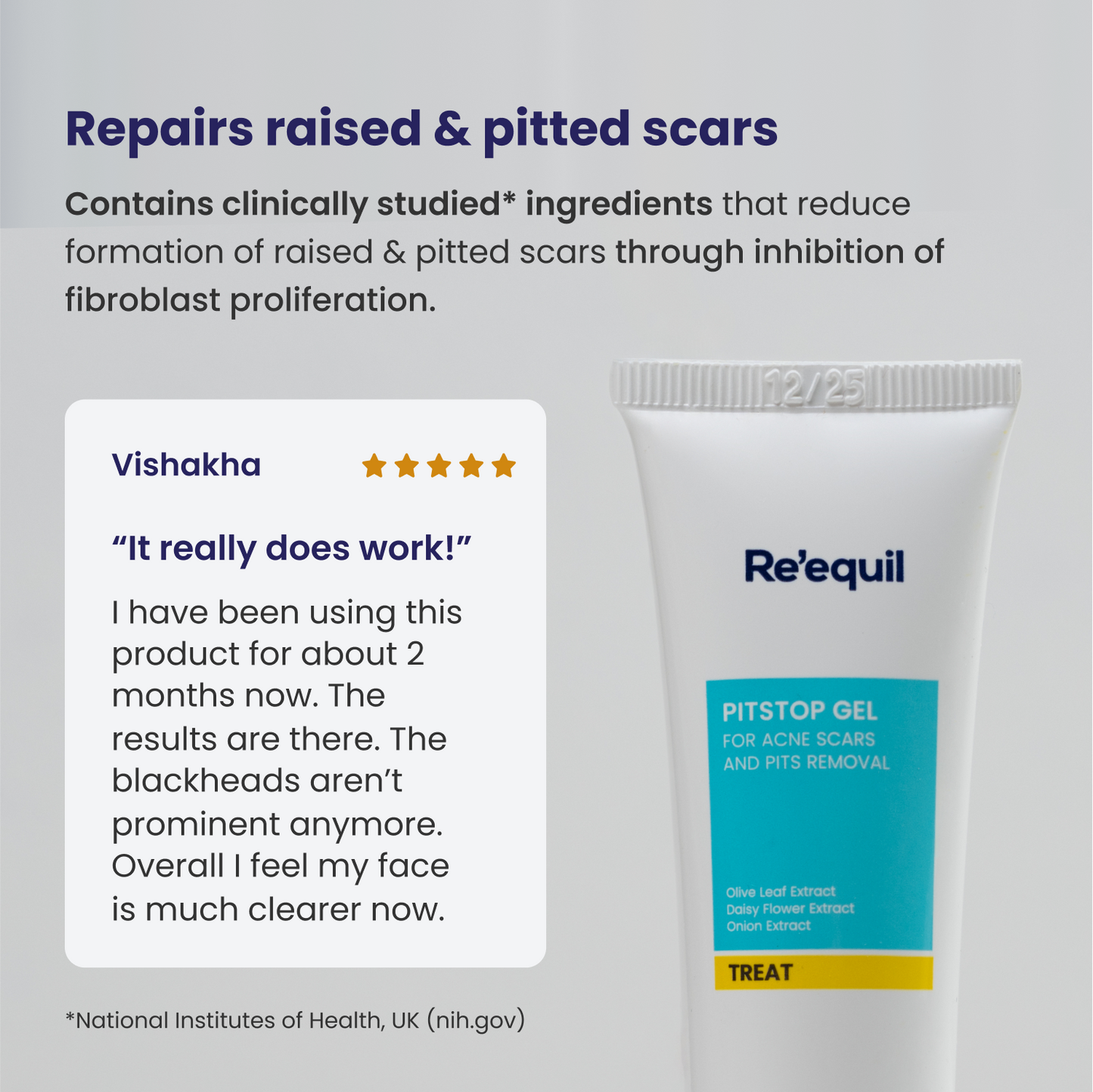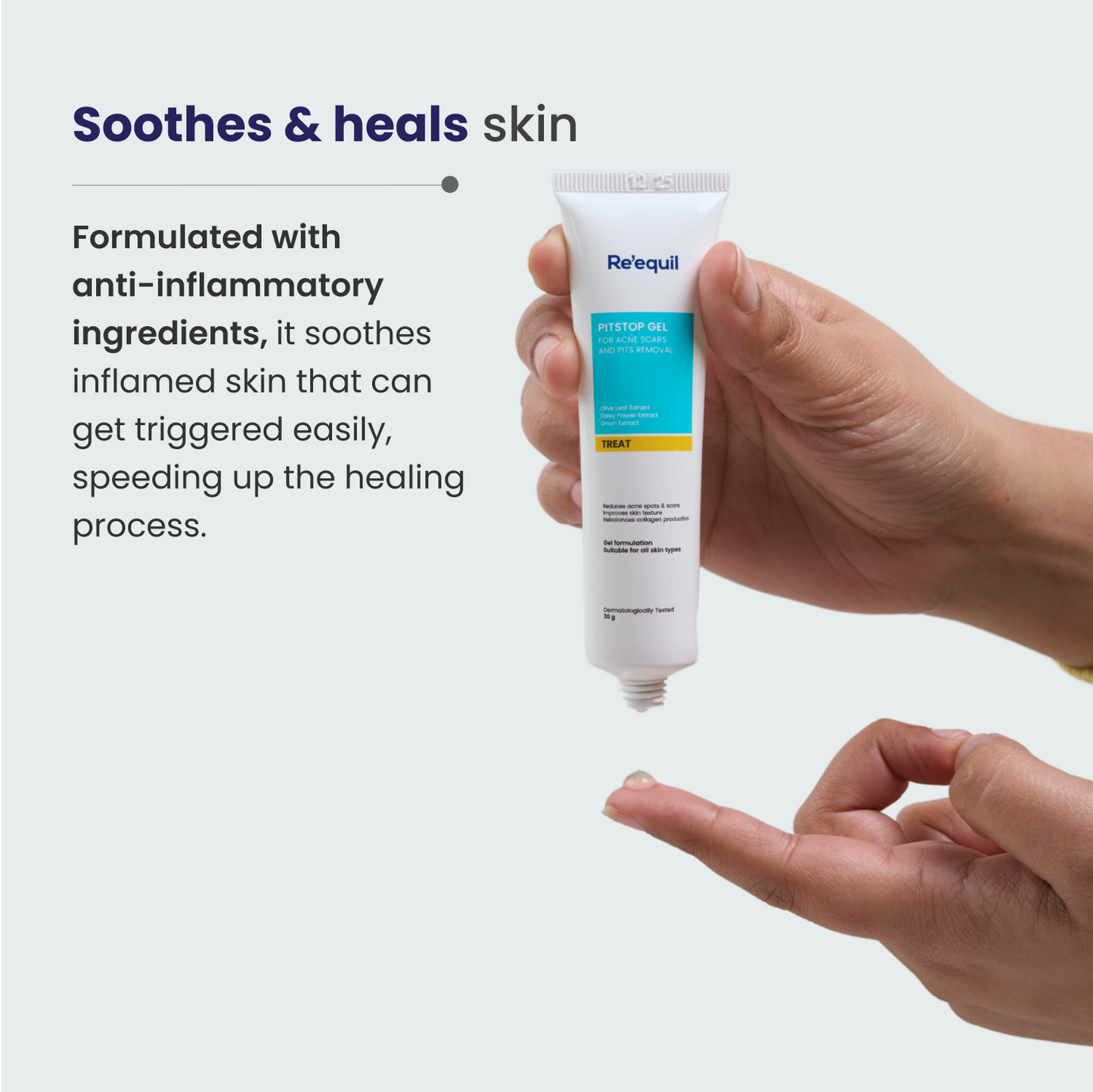 Based on clinical trials conducted on 34 individuals (male & female), having acne-induced post-inflammatory hyperpigmentation, mixed oily to oily skin & visible atrophic scars, for efficacy of Re’equil Pitstop Gel