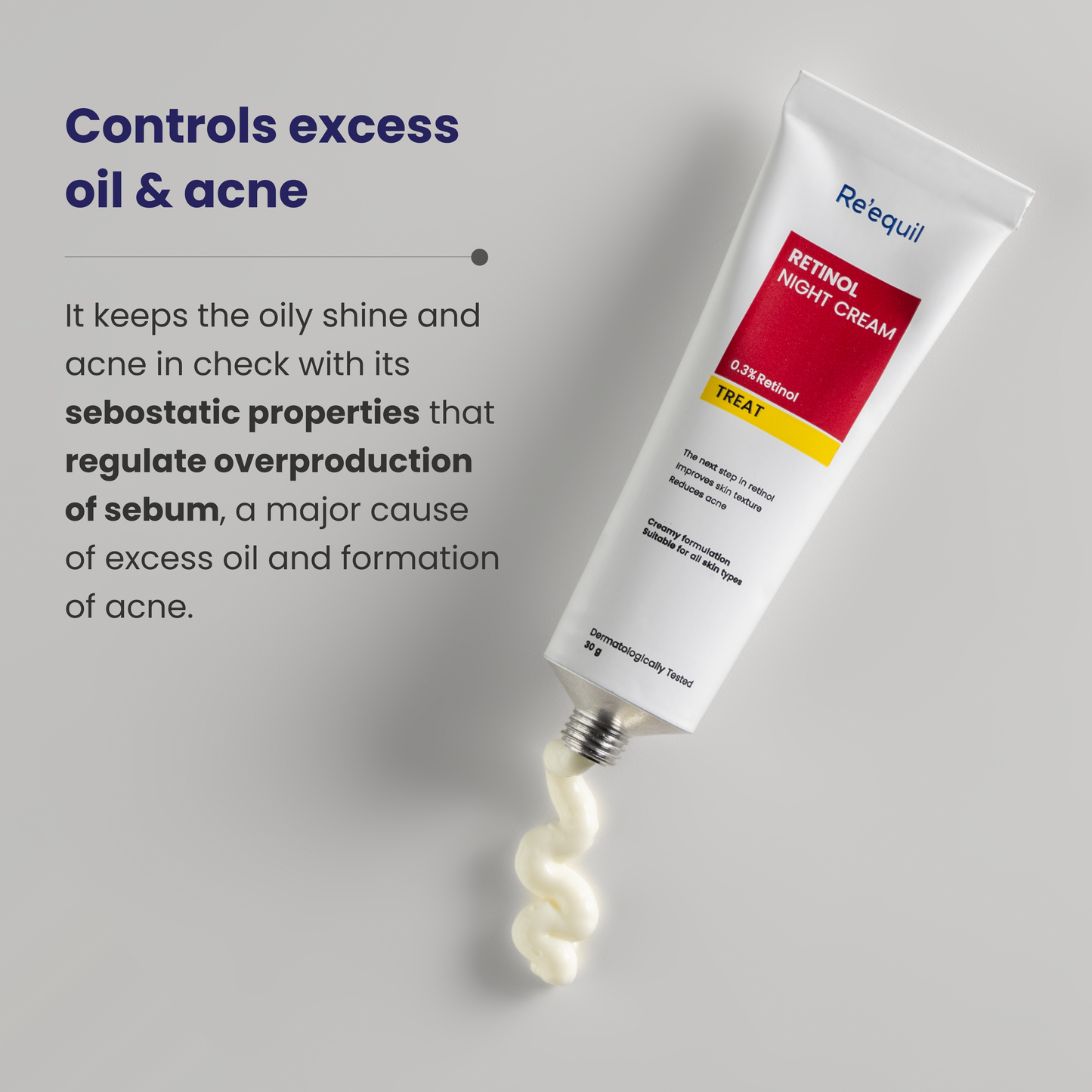 Retinol is great for oily skin. 0.3% Retinol Night Cream has sebostatic properties that regulate the activity of sebaceous glands, controlling excess oily shine. Not just this, it also normalizes keratinization, which prevents dead skin cell buildup within pores. This reduces pore clogging and visible pore size, a common concern for oily skin.