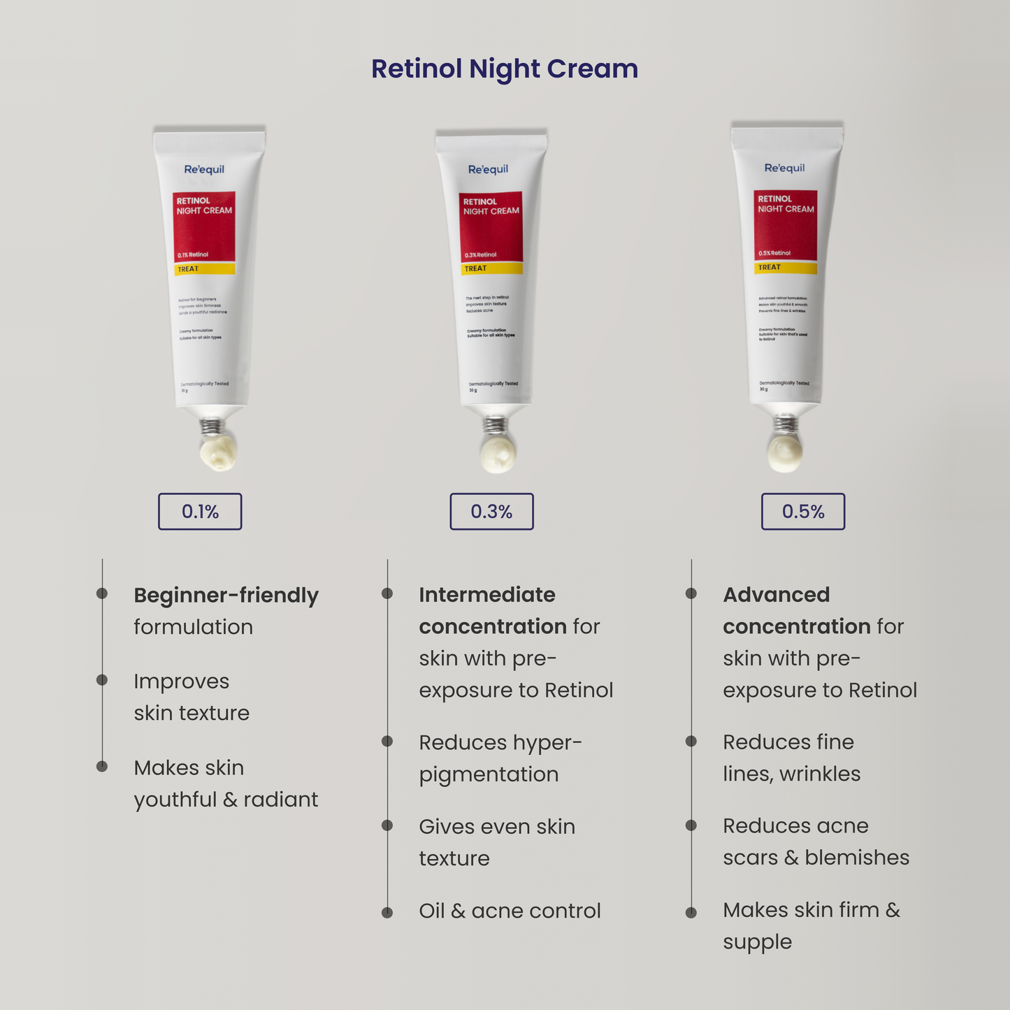 0.3% Retinol Night Cream offers an intermediate concentration for those with skin that has a pre-exposure to Retinol and need a stronger concentration for stubborn pigmentation and acne control. For those with sensitive skin, start with a low frequency and amount. Start with 2-3 applications a week, using only a pea-sized amount on entire face.