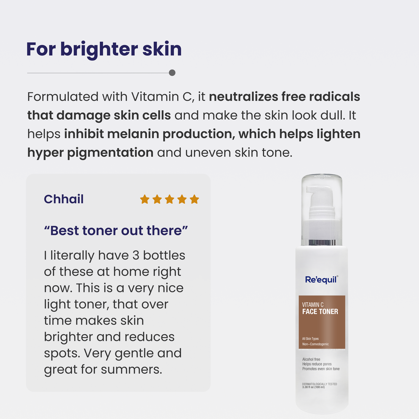 Vitamin C is a powerful antioxidant that helps neutralise free radicals that damage skin cells and also contribute to ageing. It also helps inhibit melanin production, the pigment responsible for skin colour. It leads to a brighter and more radiant complexion and helps fade hyperpigmentation.